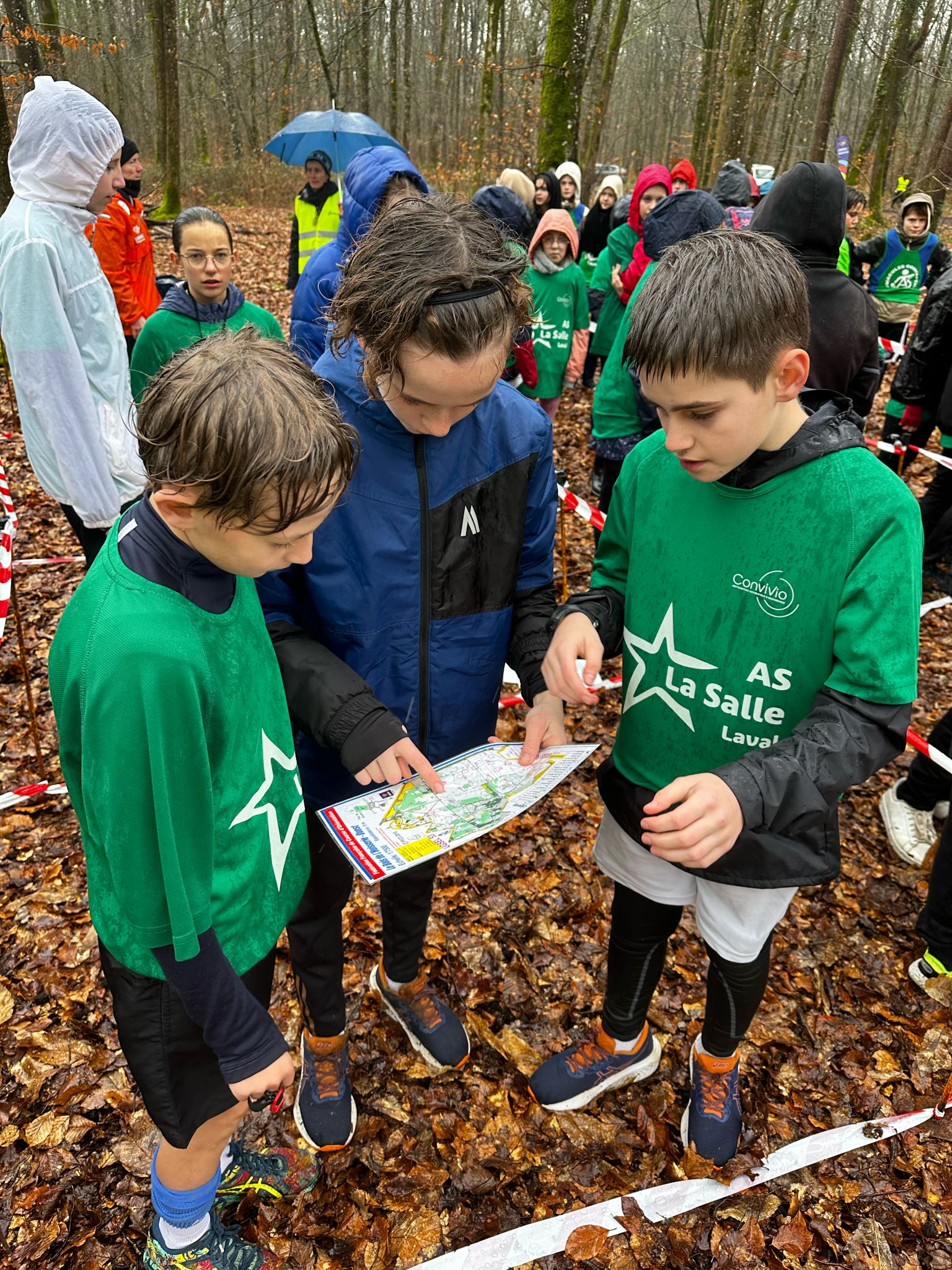 Le bois de l’Huisserie était le théâtre du rendez-vous départemental de Course d’Orientation. Plus de 100 équipes de 3 élèves ont alternés les départs dans les bois pour retrouver et pointer le maximum de balises en une heure. Petite variante pour les lycéens = chaque membre de l’équipe disposait d’un doigt de pointage, ce qui obligeait l’équipe à se répartir les balises à trouver. Un objectif relevé, d’autant plus avec la météo très très très humide de la journée !